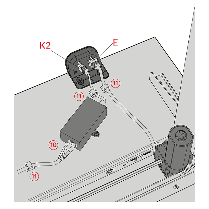 Step 11. Connect the wiring from the control unit (K2) to the power block and to the motor (E). Secure the cabling in place using the cable clips (11). Connect the power plug (10) to the power block.
