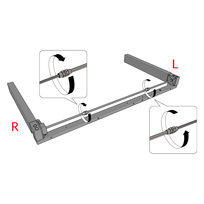 Step 3. Connect left and right leg with the motor shaft extension. Loosen both end locking nuts to allow the shaft to extend to the correct length.