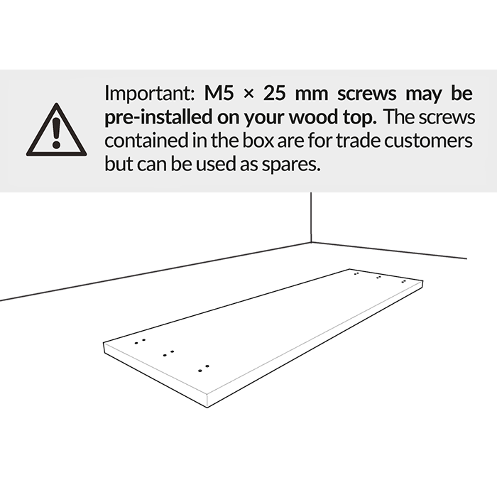 For bench tops with pre-inserted M5 x 25mm screws: remove all the screws before proceeding to position the legs.