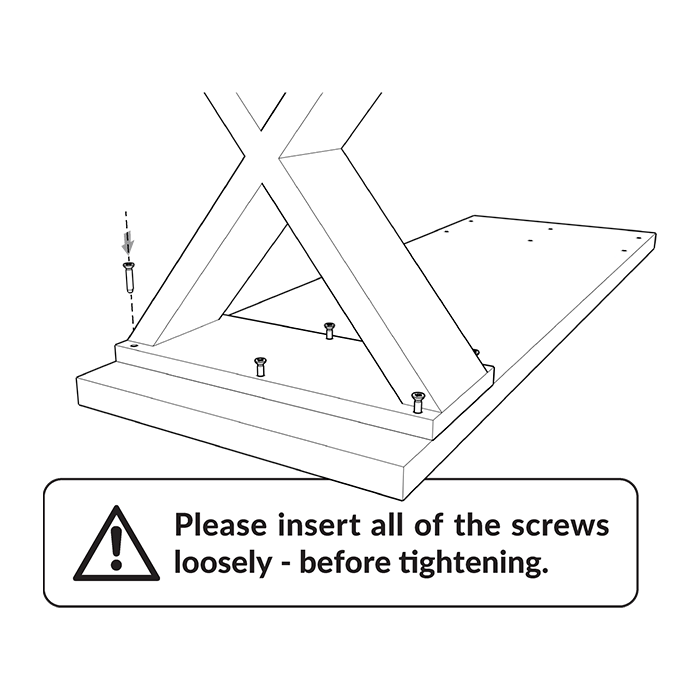 Step 3. Secure the legs in position and fasten them to the top using the provided pan head screws and an electric/impact screwdriver (recommended) ensuring a secure attachment of the legs. Tighten the screws to 60%, when all are in position, you can then fully tighten. Avoid over-tightening the screws.